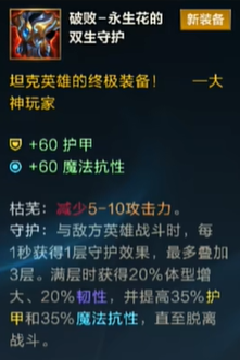 设备介绍 3100克 +60 护甲 +60 魔法抗性 枯萎:攻击强度降低5-10。 守护:与敌方英雄战斗时,每1秒获得1层守护效果,最多3层。完全堆叠后,体型增加20%,韧性增加20%,护甲增加35%,魔法抗性增加35%,直到脱离战斗。